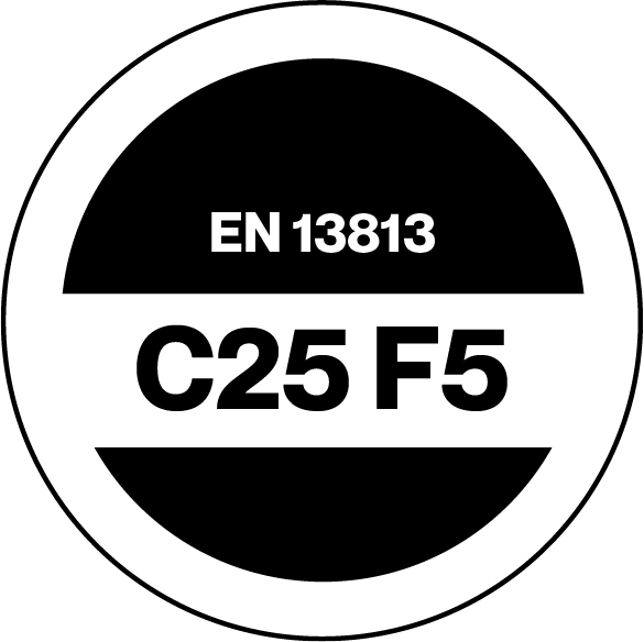 CT – C25 – F5 according to EN 13813, fire behaviour A1 fl.