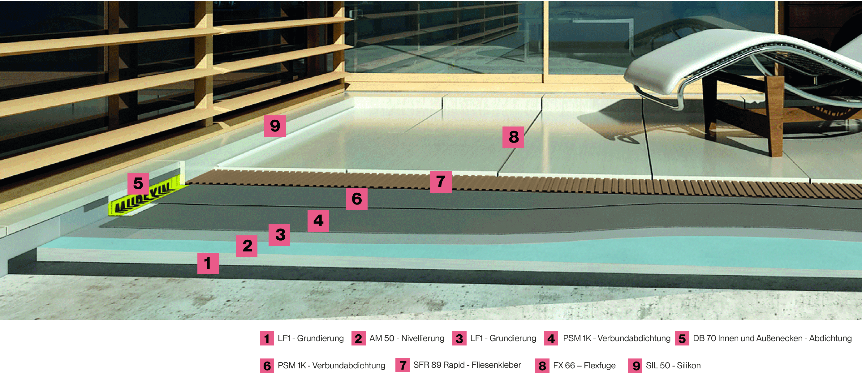 - Keine Randzonenverschmutzung bei Naturstein – auch für Schwimmbecken und Nassräume geeignet